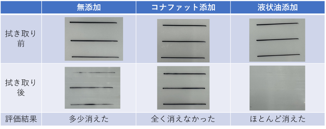 オレフィン系樹脂はインクや接着剤などの定着性が低く、くっつきにくいという課題がありますが、これらの樹脂にコナファットを添加することで、定着性向上が期待できます。オレフィン系樹脂へのインク定着性向上の様子